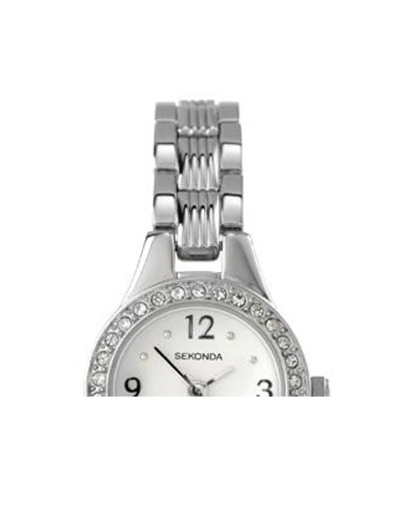 Sekonda ladies watch has a round chrome finish crystal set case with a white coloured dial. The dial features chrome finish hour markers hour minute and seconds hands.