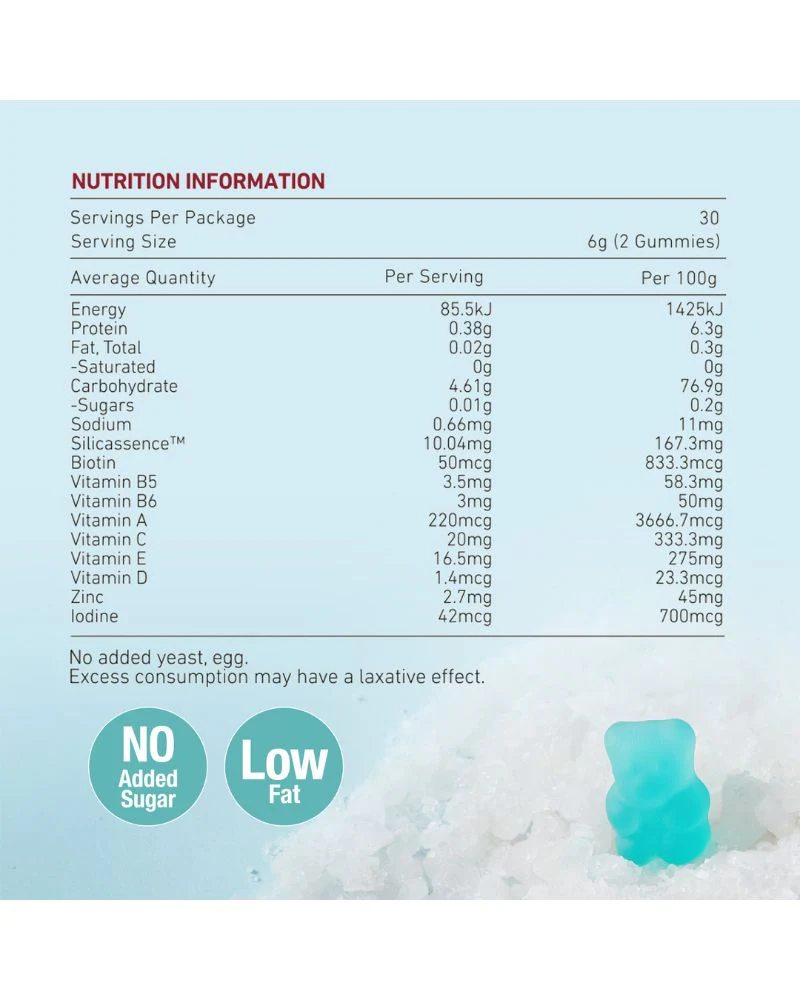 Award Winning Hair Vitamin Gummies with exclusive core ingredient Silicassenceā¢, formulated together with Biotin, Zinc, Vitamin A, B5, B6, C, D, E, Iodine for thicker and stronger hair.